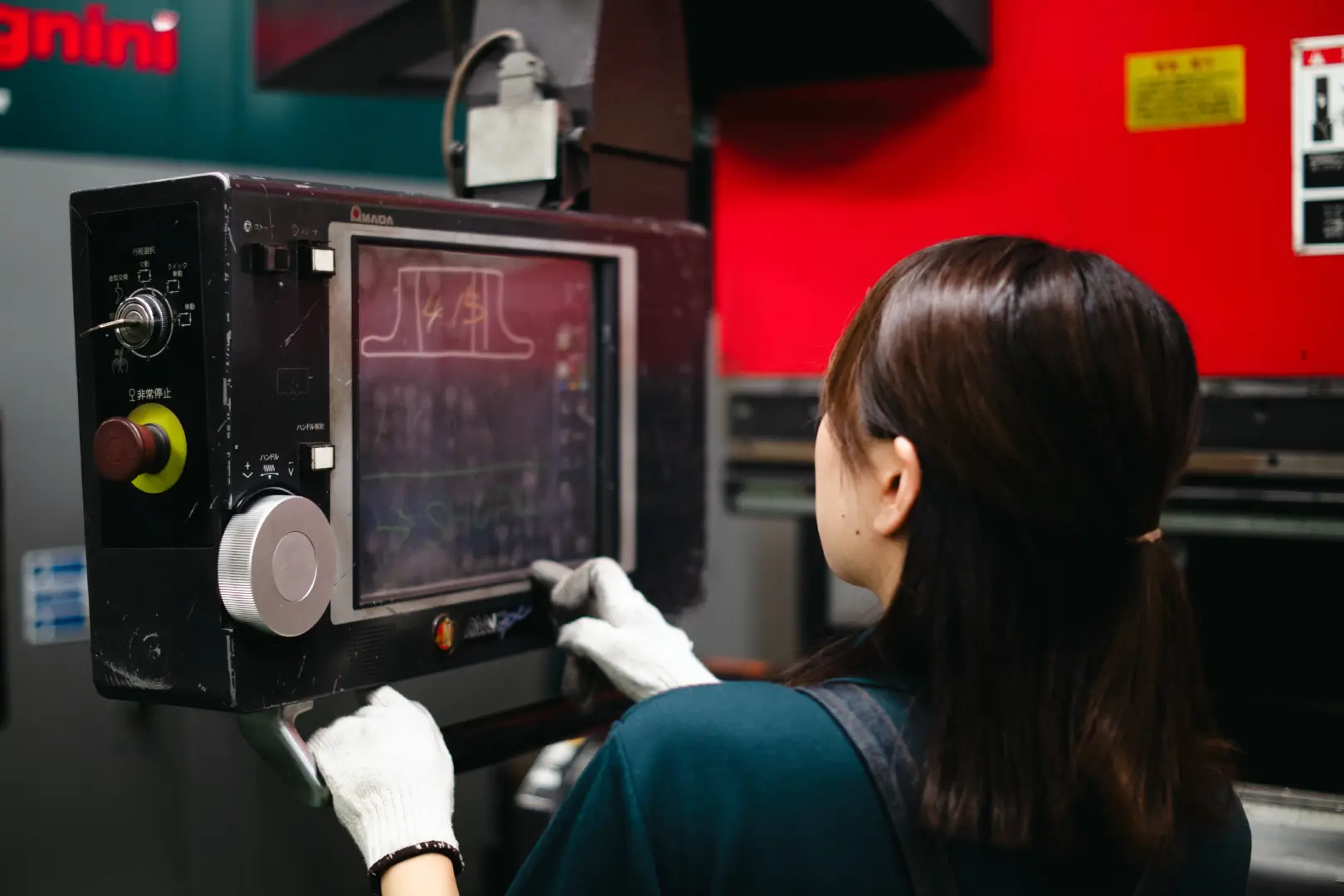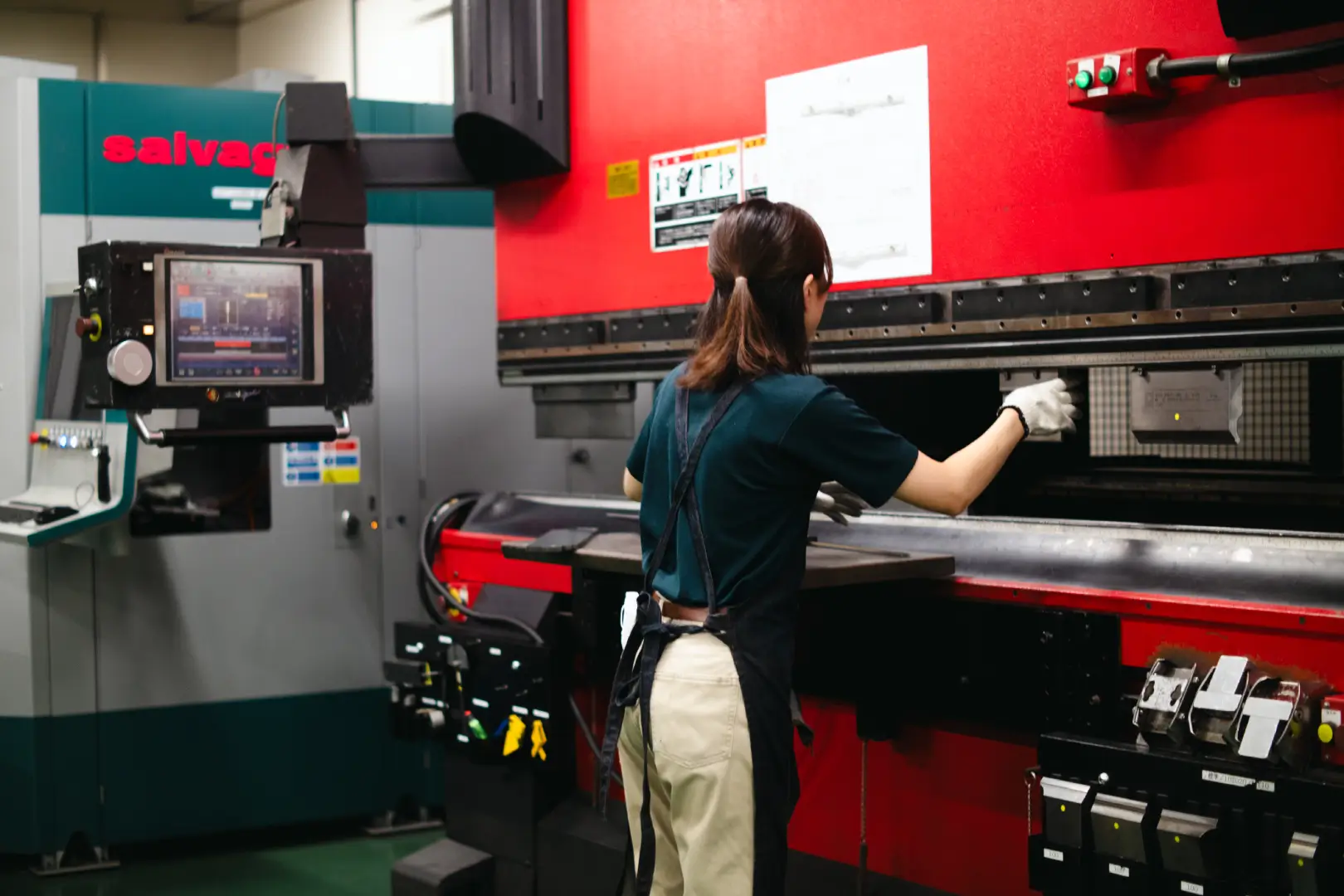 イワサキはAMADA製のプレスブレーキとサルバニーニ製のパネルベンダーを保有しており、製品サイズや形状に合わせて2つの機械を使い分けています。大型の製品を手に持って何台もブレーキで曲げることは女性はもちろん男性にも身体的負担が大きいです。